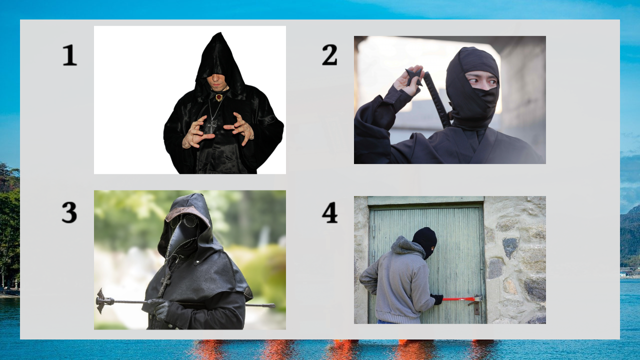 1 is a sorcerer, 3 is a plague mask, 4 is just a mugger, and 2 is a Japanese ninja.