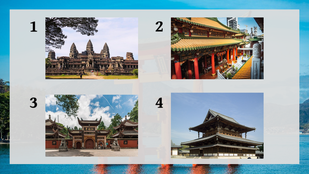 1 is Angkor Wat in Cambodia, 2 is San Feng Palace in Taiwan, 3 is Hongfu Temple in China, and 4 is Horyuji Temple in Japan.