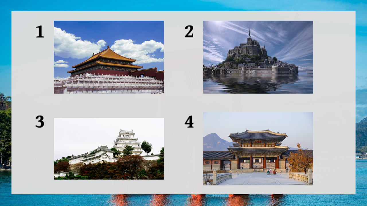 1 is the Forbidden City in China, 2 is Mont Saint-Michel in France, 4 is Gyeongbok-gung in Korea, and 3 is Himeji Castle in Japan.