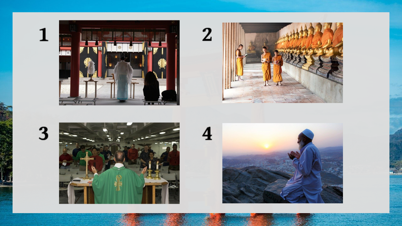2 is a Thai Buddhist, 3 is a Christian priest, 4 is a Muslim, and 1 is a Japanese Shinto priest.