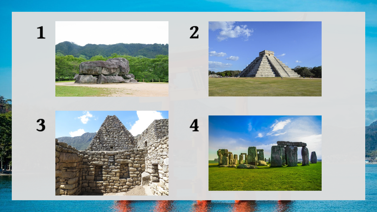 2 is the Temple of Kukulcan in Mexico, 3 is Machu Picchu in Peru, 4 is Stonehenge in England, and 1 is the Ishibutai Kofun in Japan.