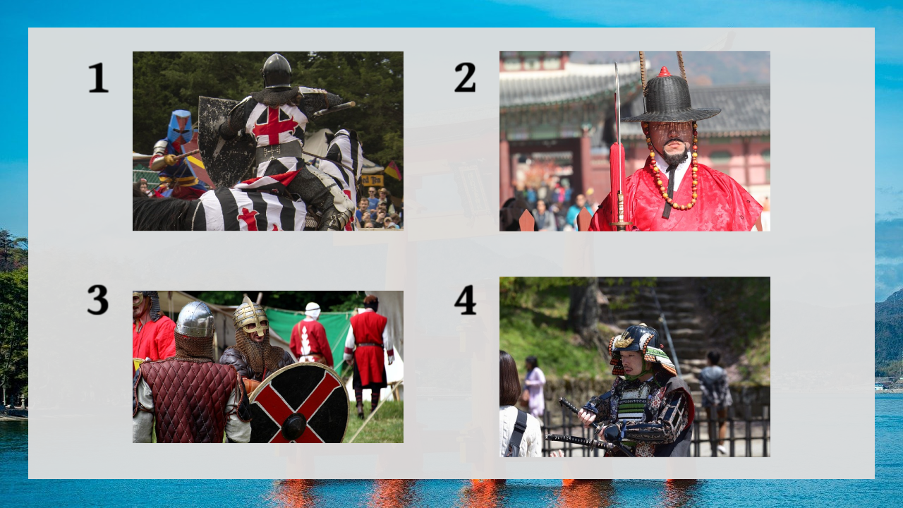 1 is a crusader soldier, 2 is a Korean Yangban(Muban), 3 is a Viking, and 4 is a Japanese samurai.