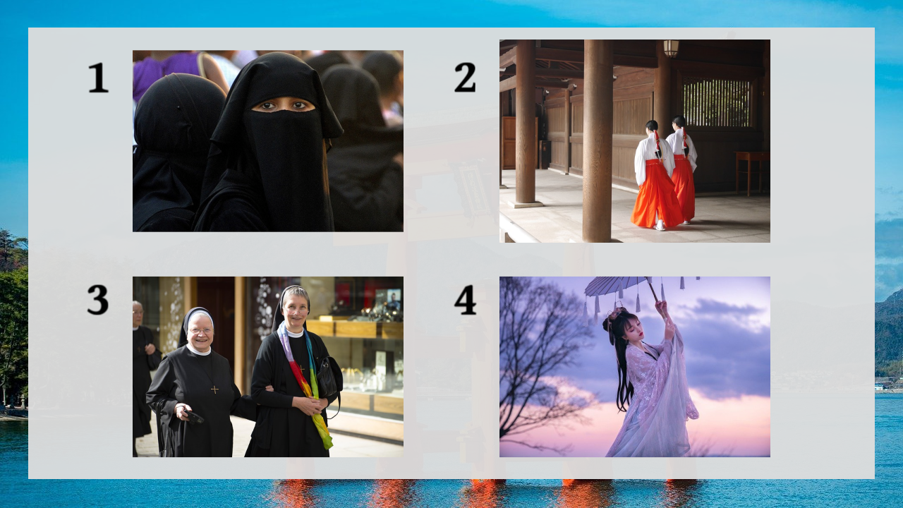 1 is a Muslim woman, 3 is a Christian sister, 4 is a Chinese celestial maiden, and 2 is a Japanese shrine maiden.