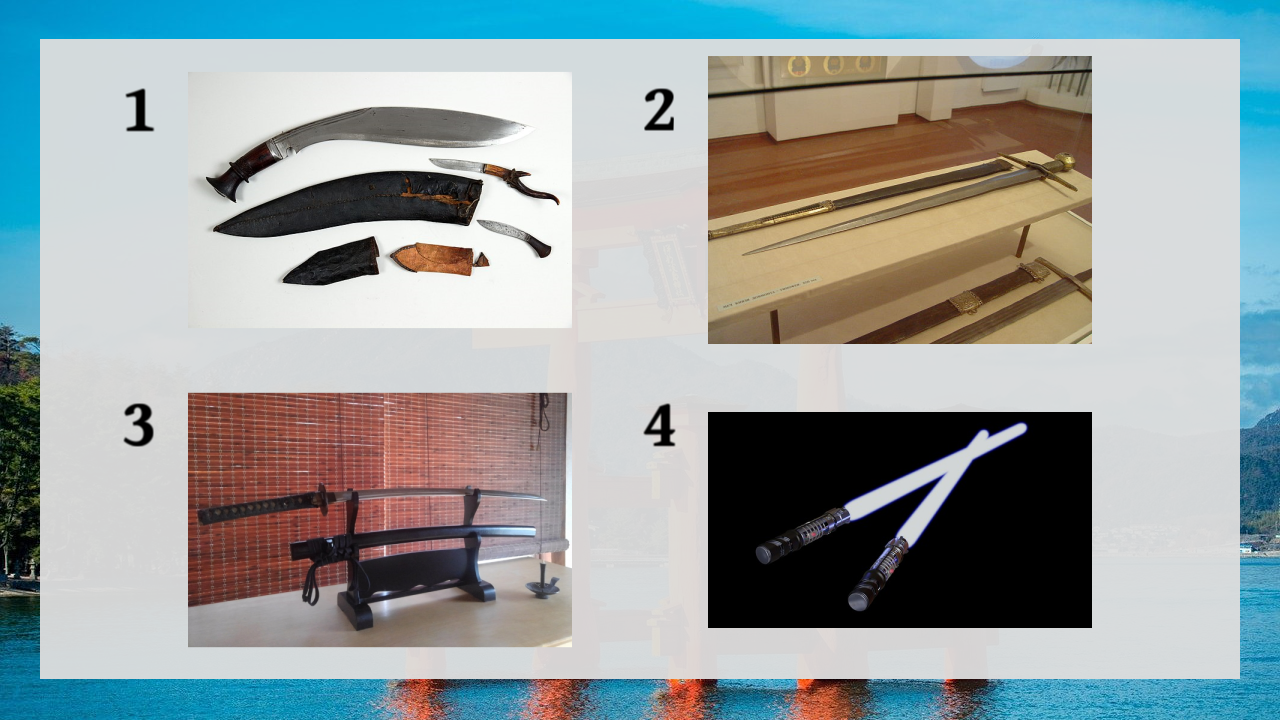 1 is the kukri of Nepal and India, 2 is the longsword of Western Europe, 4 is the lightsaber of the Jedi, and 3 is the Katana of Japan.