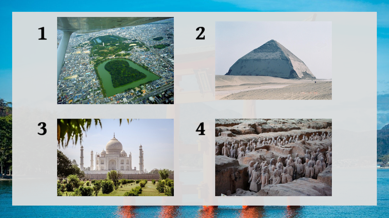 2 is the Bent Pyramid in Egypt, 3 is the Taj Mahal in India, 4 is the Terracotta Warriors in China, and 1 is the Tomb of Emperor Nintoku in Japan.